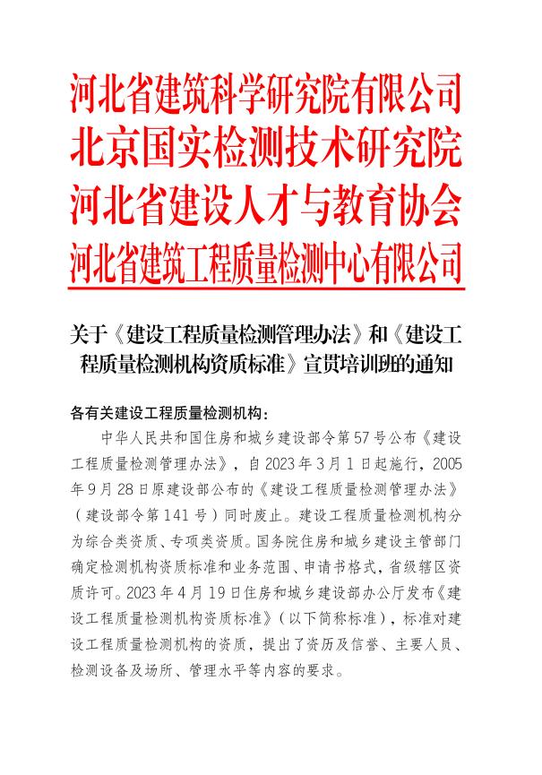 關于《建設工程質量檢測管理辦法》和《建設工程質量檢測機構資質標準》宣貫培訓班的通知