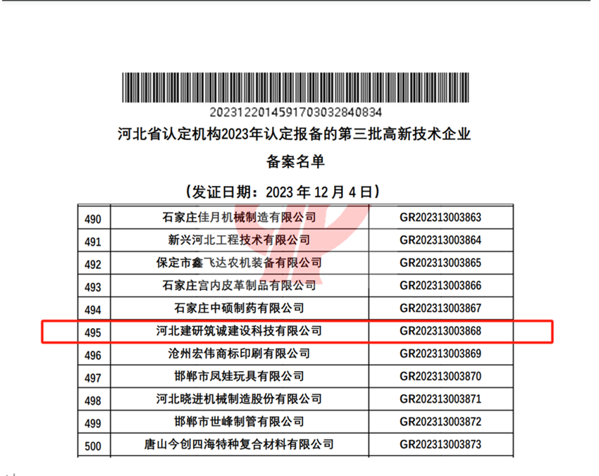 20231220日,全國(guó)高新技術(shù)企業(yè)認(rèn)定管理工作領(lǐng)導(dǎo)小組辦公室公示了河北省認(rèn)定機(jī)構(gòu)2023年認(rèn)定報(bào)備的第三批高新技術(shù)企業(yè)備案名單,河北建研筑誠(chéng)建設(shè)科技有限公司順利通過(guò)了國(guó)家高新技術(shù)企業(yè)認(rèn)定(證書(shū)編號(hào)GR202313003868),標(biāo)志著公司在科技創(chuàng)新的道路上又邁出了堅(jiān)實(shí)的一步。